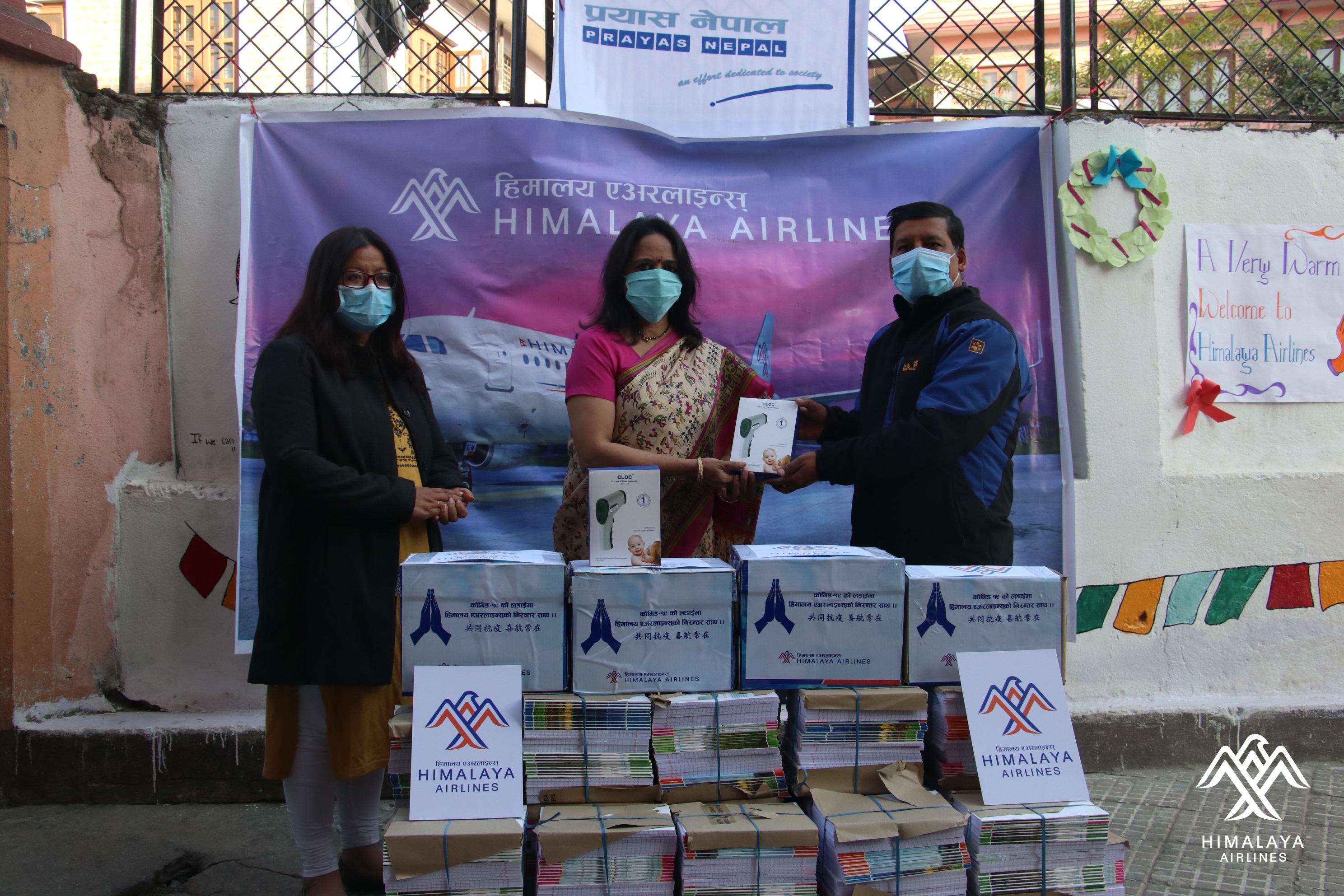 During a brief visit to Prayas Nepal on December 31, 2020, the officials of Himalaya Airlines handed over the educational and medical supplies to Prayas Nepal office bearers maintaining all the COVID-19 safety protocols. The contribution included 1,650 notebooks, two infrared thermometers, 24 bottles of hand sanitizers and 1,000 surgical face masks.