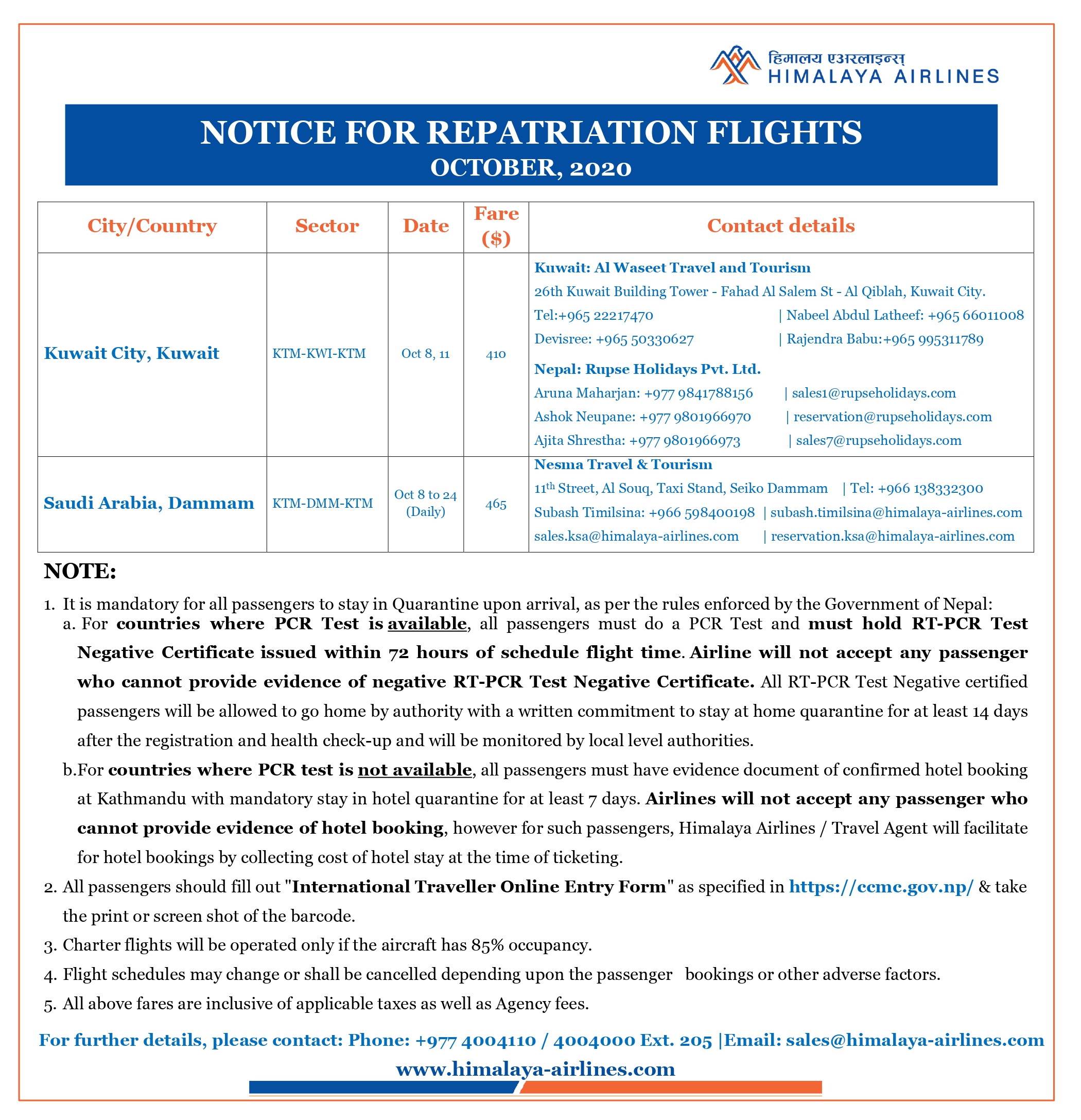 Notice for Dhaka Repatriation Flight - Oct 10, 2020