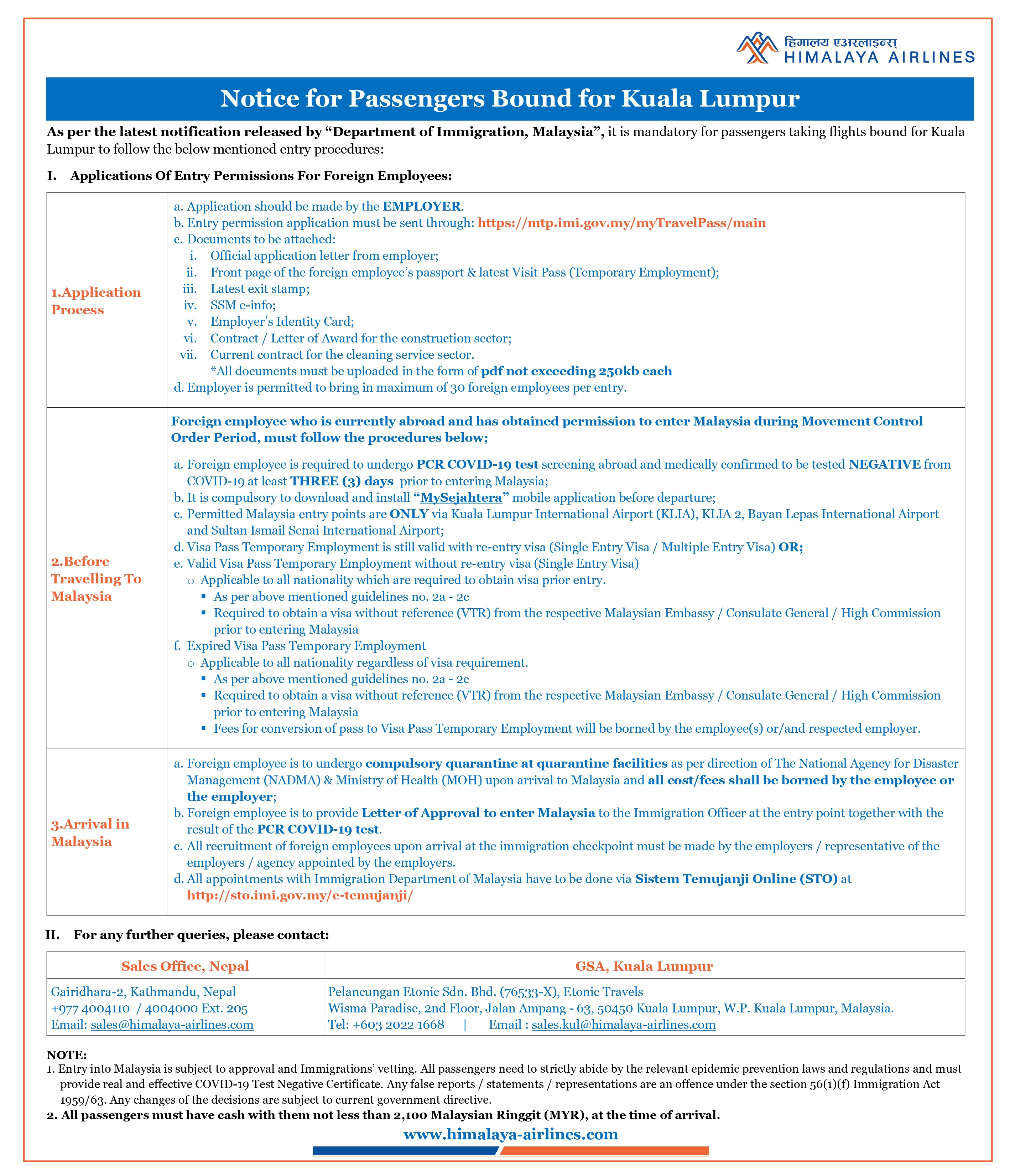 Mandatory Travel Requirement for passengers bound to Malaysia