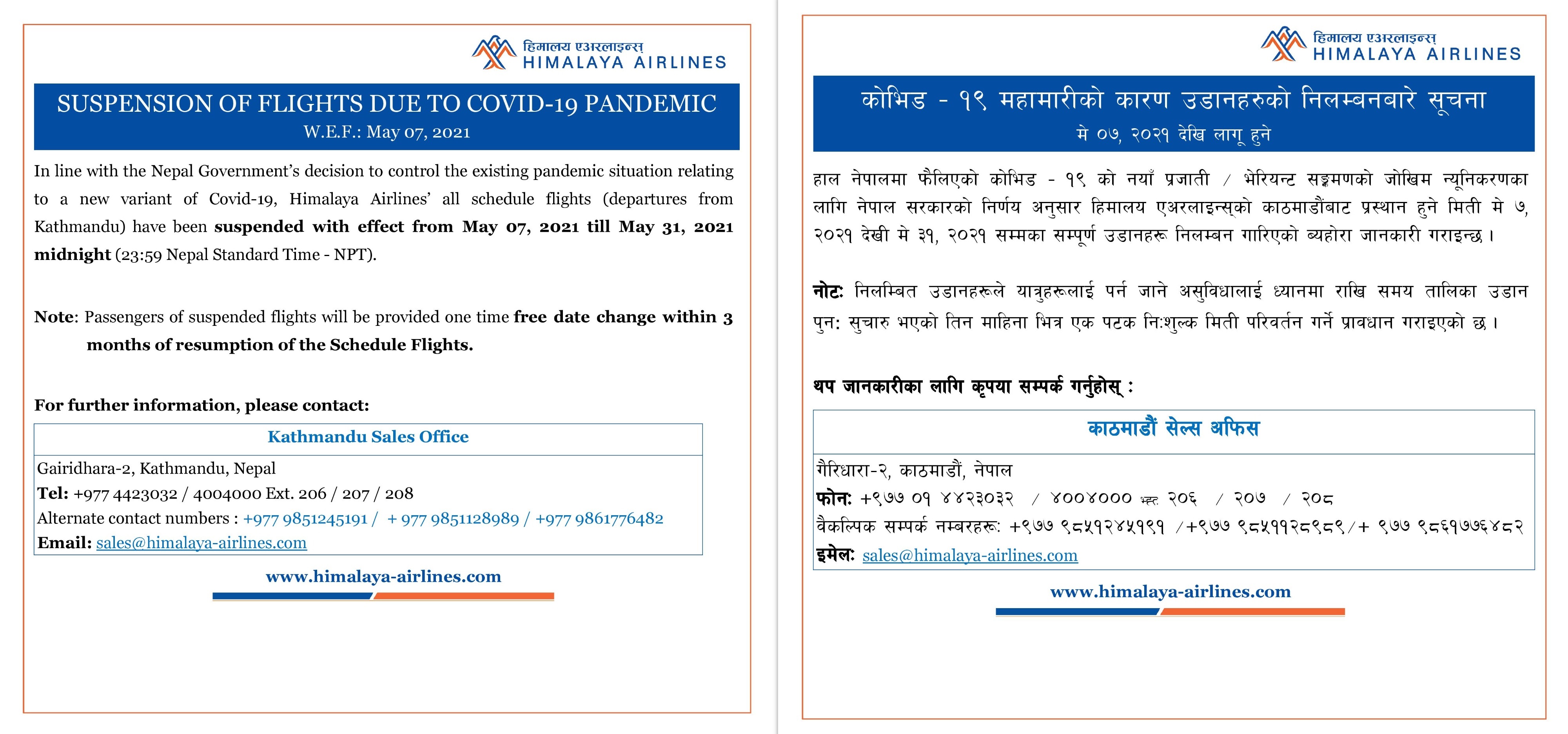 Suspension of flights due to Covid-19 Pandemic W.E.F.: 07th May, 2021