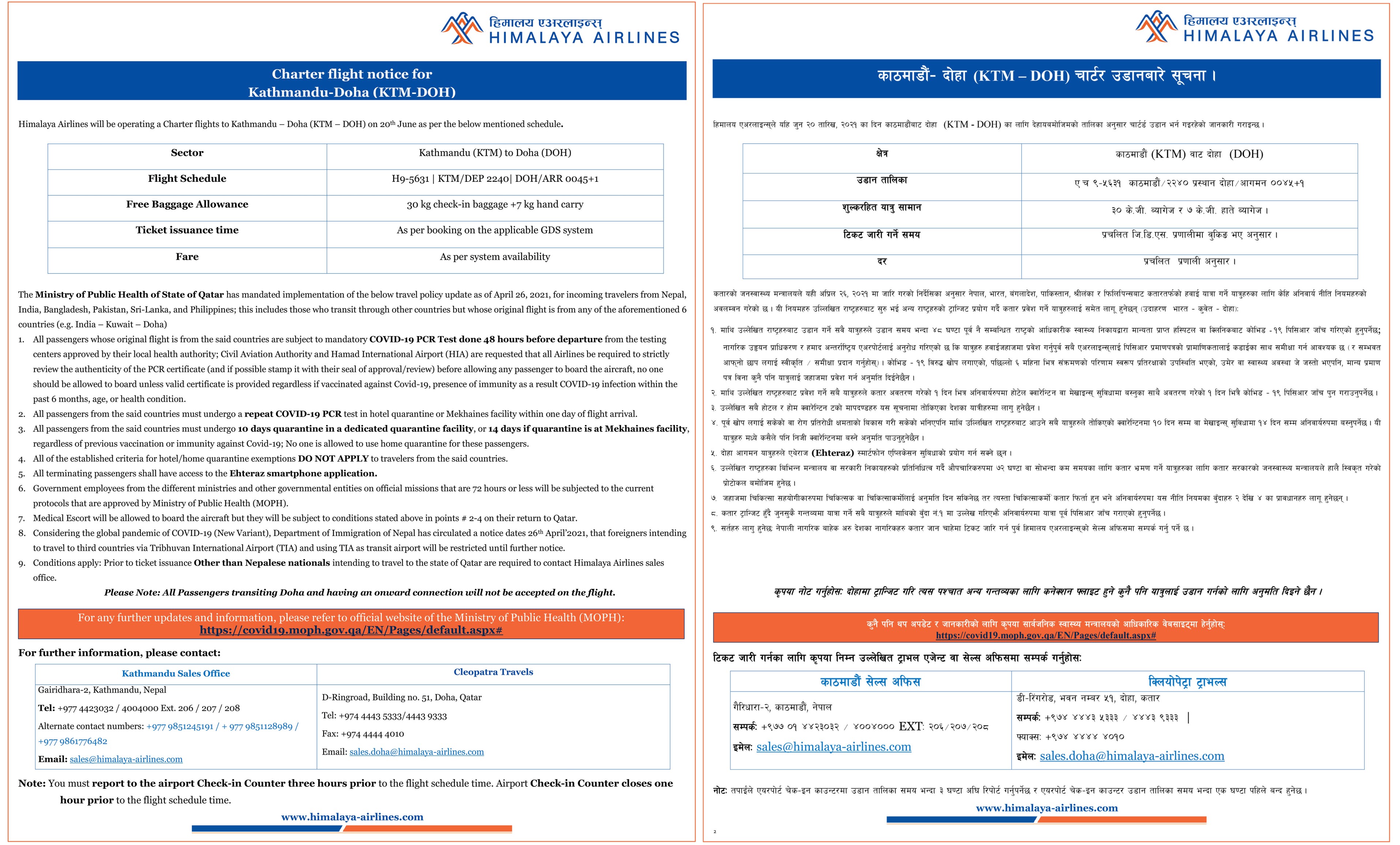 Charter Flight Notice for Doha-Kathmandu(DOH-KTM)