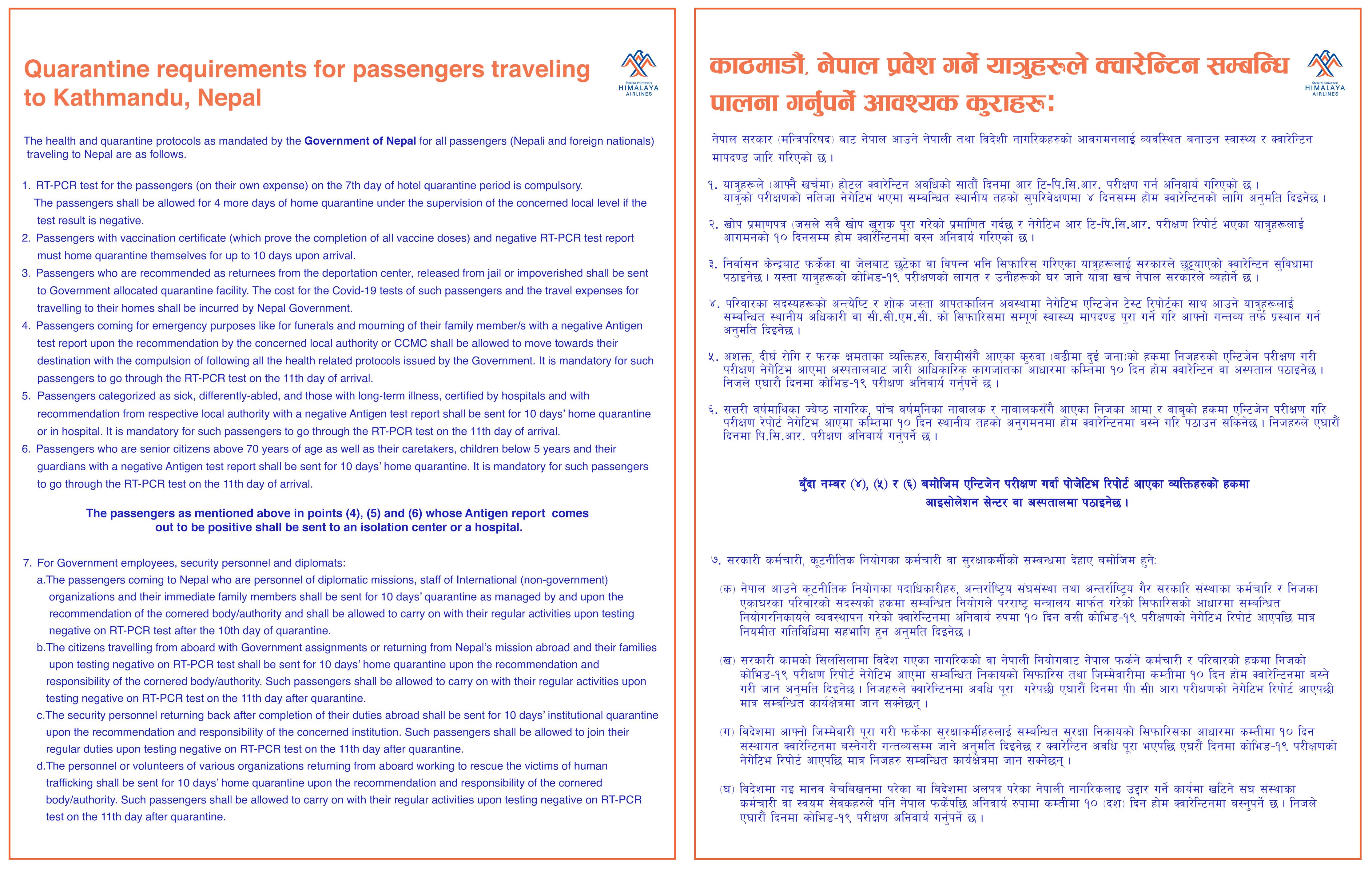 Quarantine requirements for passengers travelling to Kathmandu, Nepal