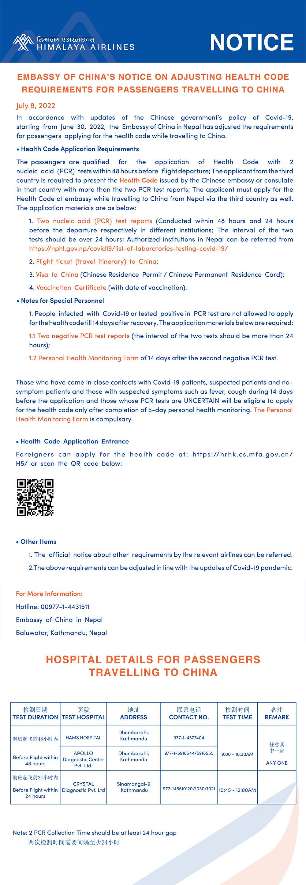 Important Notice for Passengers Travelling to China along with Hospital Details