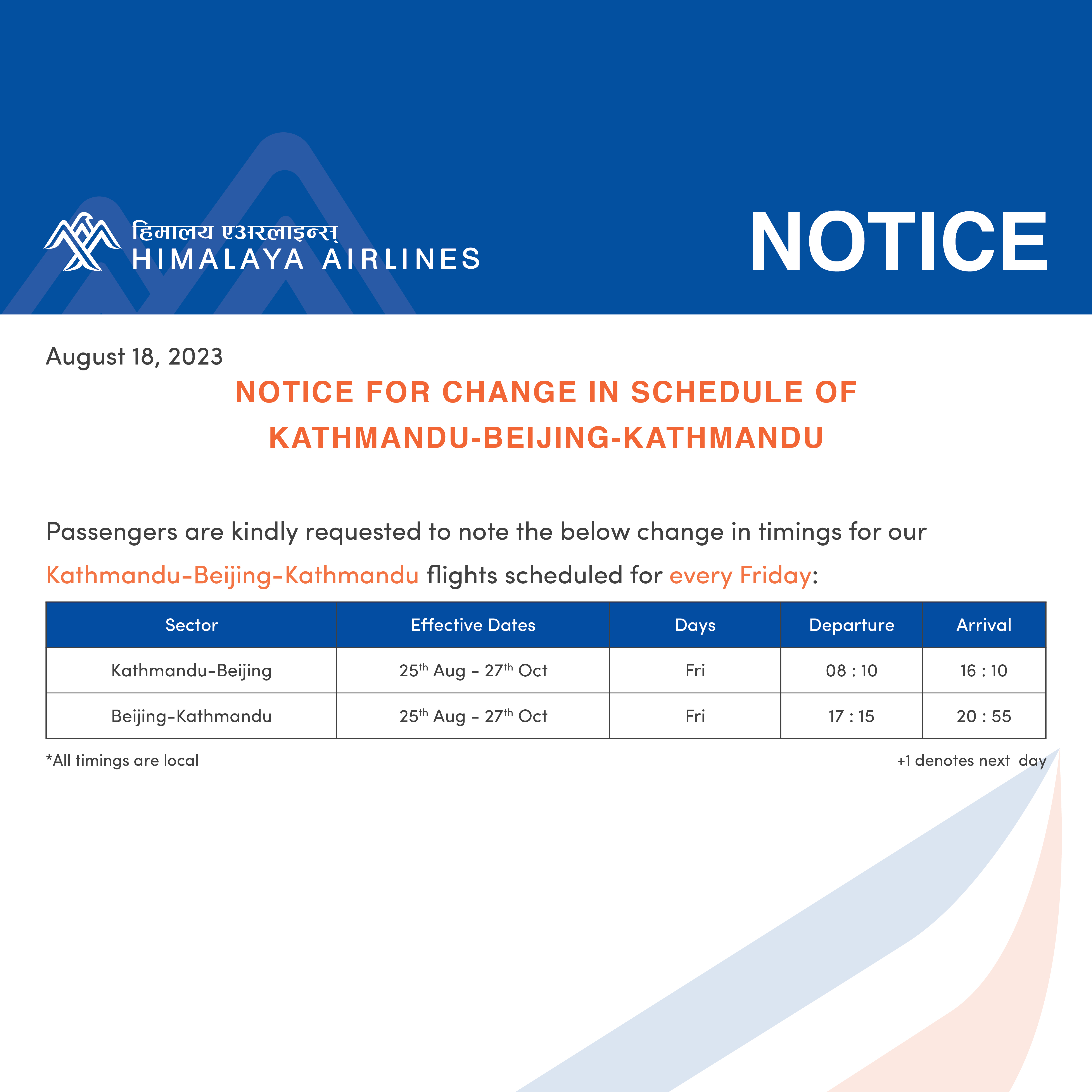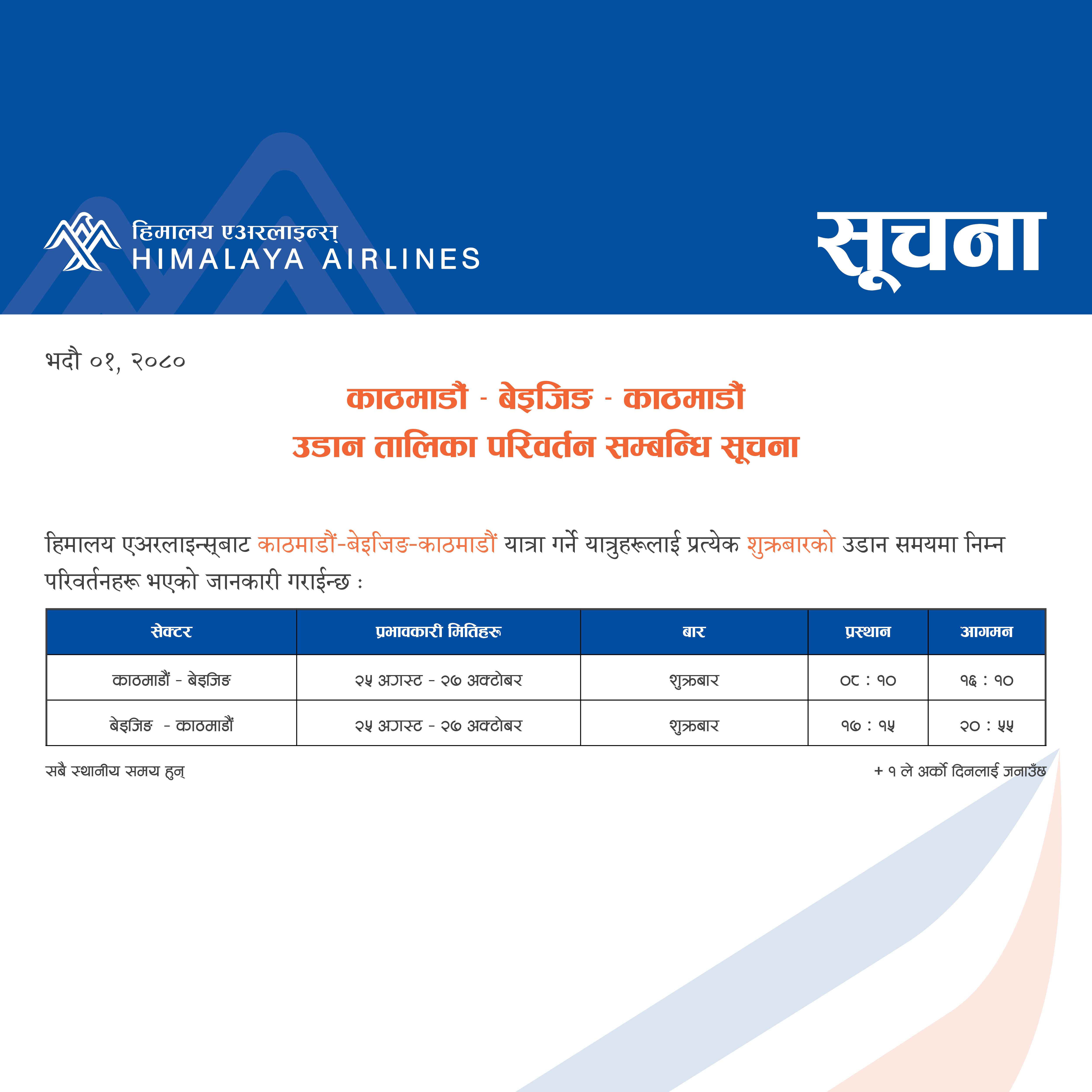 Notice for change in schedule of Kathmandu-Beijing-Kathmandu