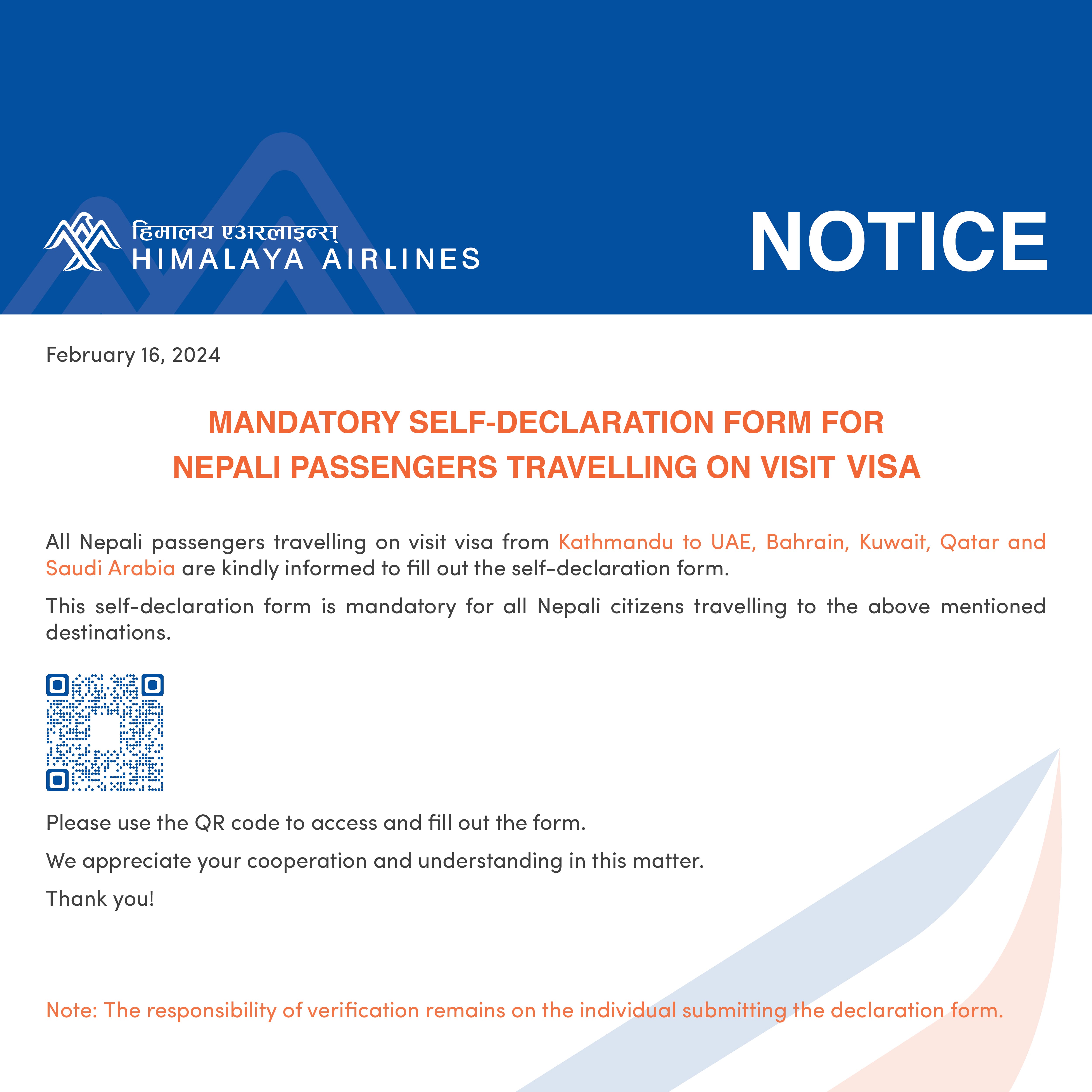 Mandatory Self-Declaration Form For Nepali Passengers Travelling on Visit Visa