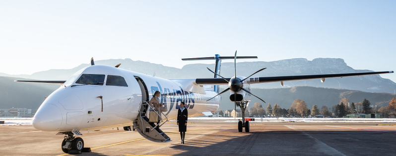 The aircraft can transport up to 76 passengers, and its technical properties make it the ideal choice for landing at Bolzano Airport. The DASH DHC-8 Q400 aircraft is a highly efficient turboprop-powered aircraft that can complete short journeys almost as quickly as a regional turbojet, but with lower emissions as well as less noise during take-off and landing.