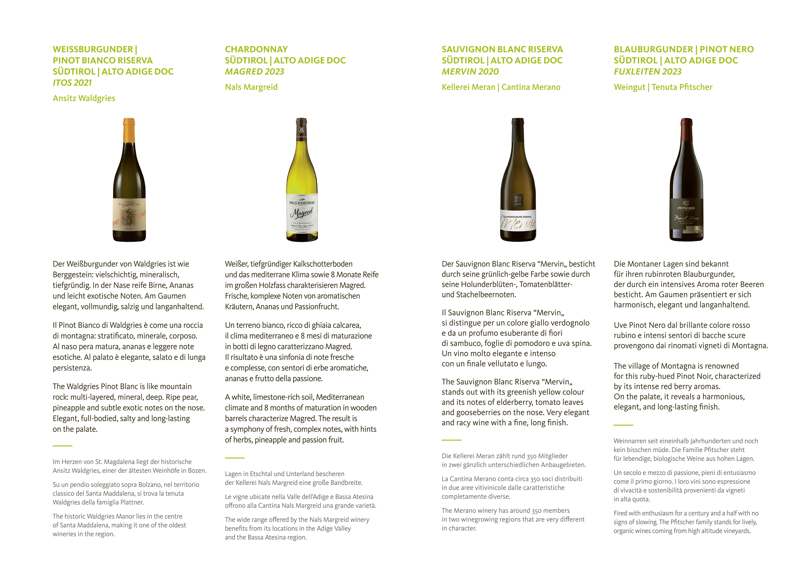 SkyAlps hat für Sie gemeinsam mit dem Konsortium Südtirol Wein 48 besondere Produzenten ausgewählt, welche an Board unserer Maschinen über das Jahr besondere Etiketten vorstellen werden. Die Weinkarte bietet jeden Monat vier neue Qualitätsweine, welche im Ticketpreis enthalten auf Ihrer Reise verkostet werden können.